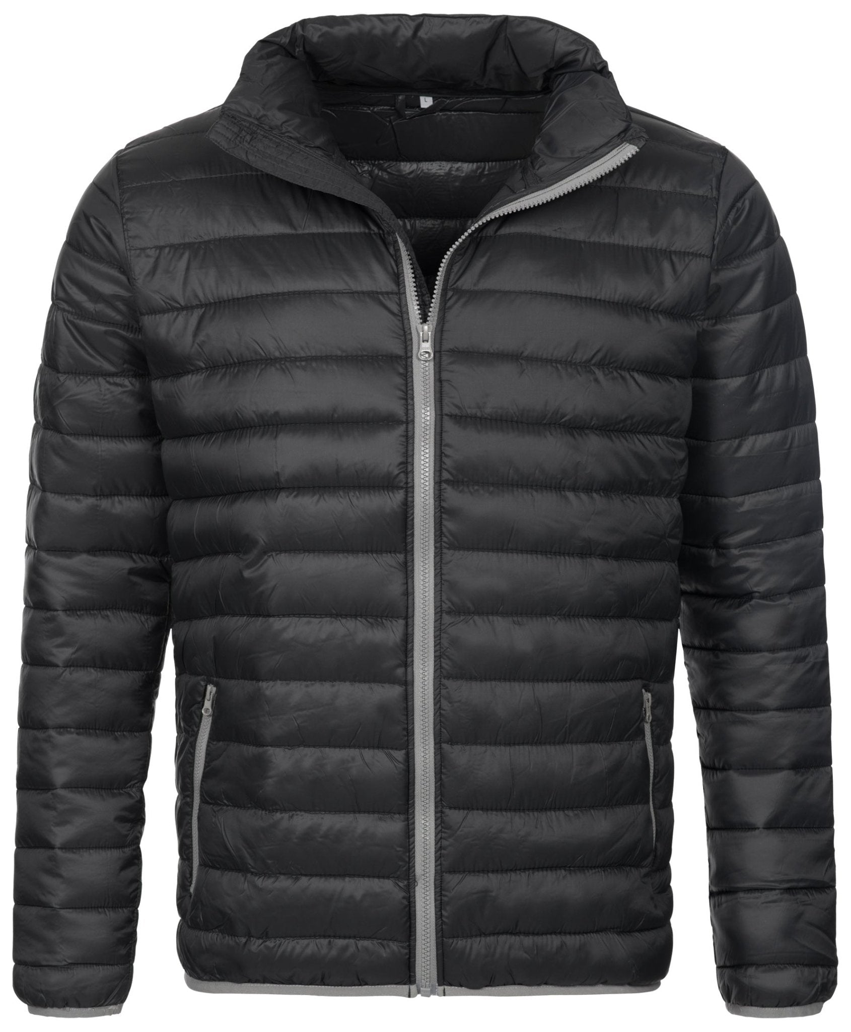 This lightweight padded jacket for men, with a glossy nylon shell and polyester filling offers excellent heat insulation and great outdoor features like a stand-up collar with built-in hood, contrast zippers and polyester bindings.