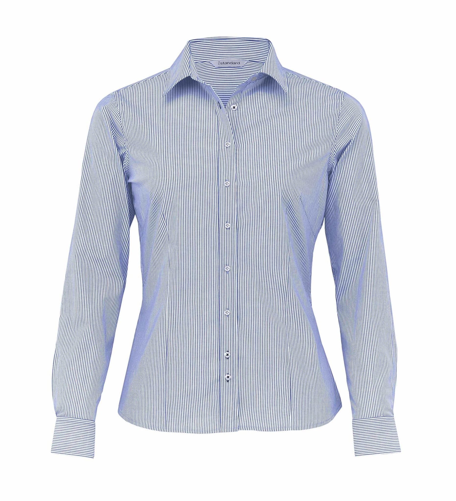 62% polyester 35% cotton 3% Lycra yarn dyed stripe|Tapered fit|Fashion collar|Long sleeves|Shaped body detailing front and back|Contoured hemline|Contrast stitch detailing on selected buttons