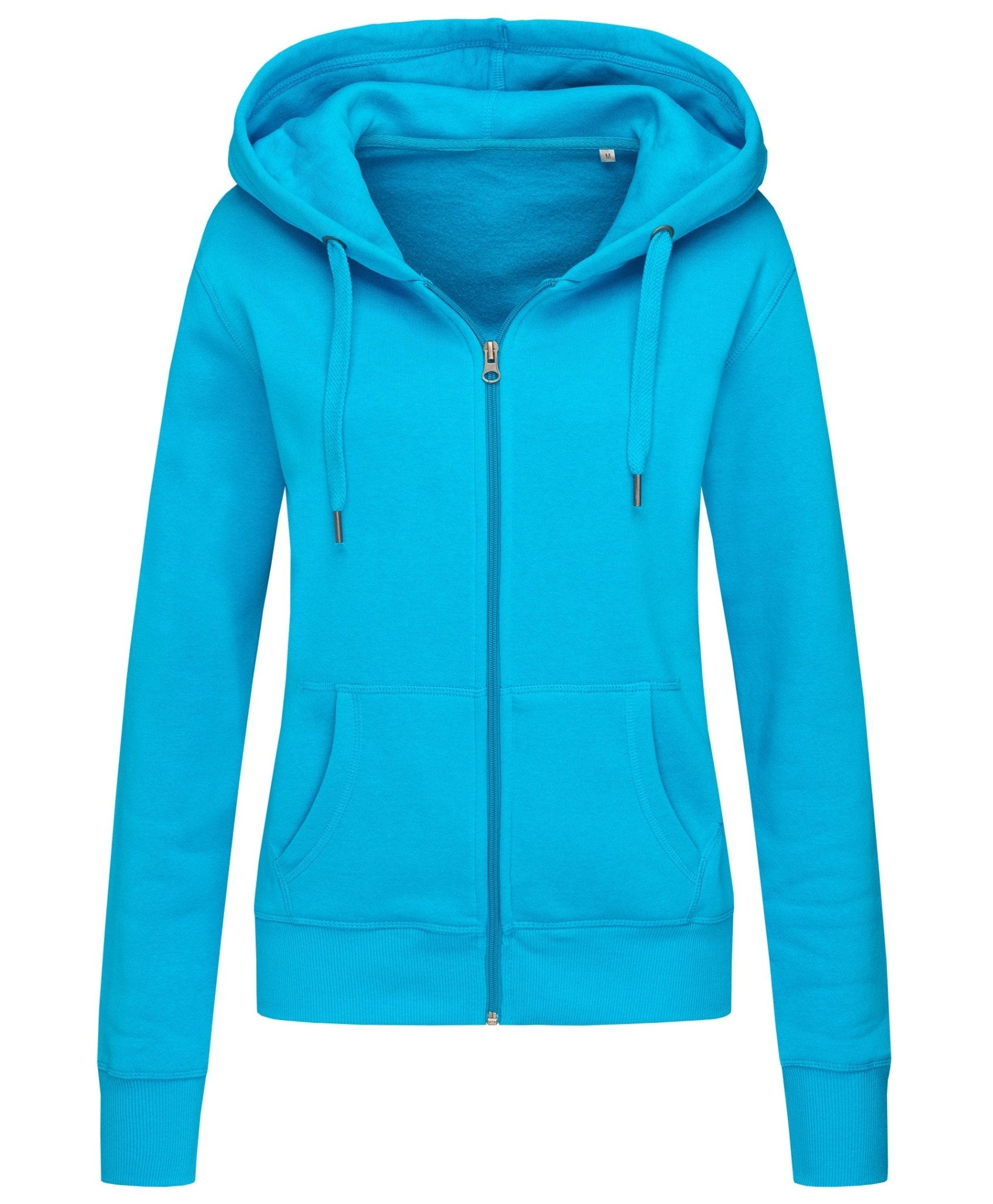 Fashionable hooded sweatjacket for women made of warm and soft cotton-polyester-blend with a modern and sporty design, kangaroo pocket, wide rib cuffs and wide draw cord. Brushed inside for extra comfort and warmth.
