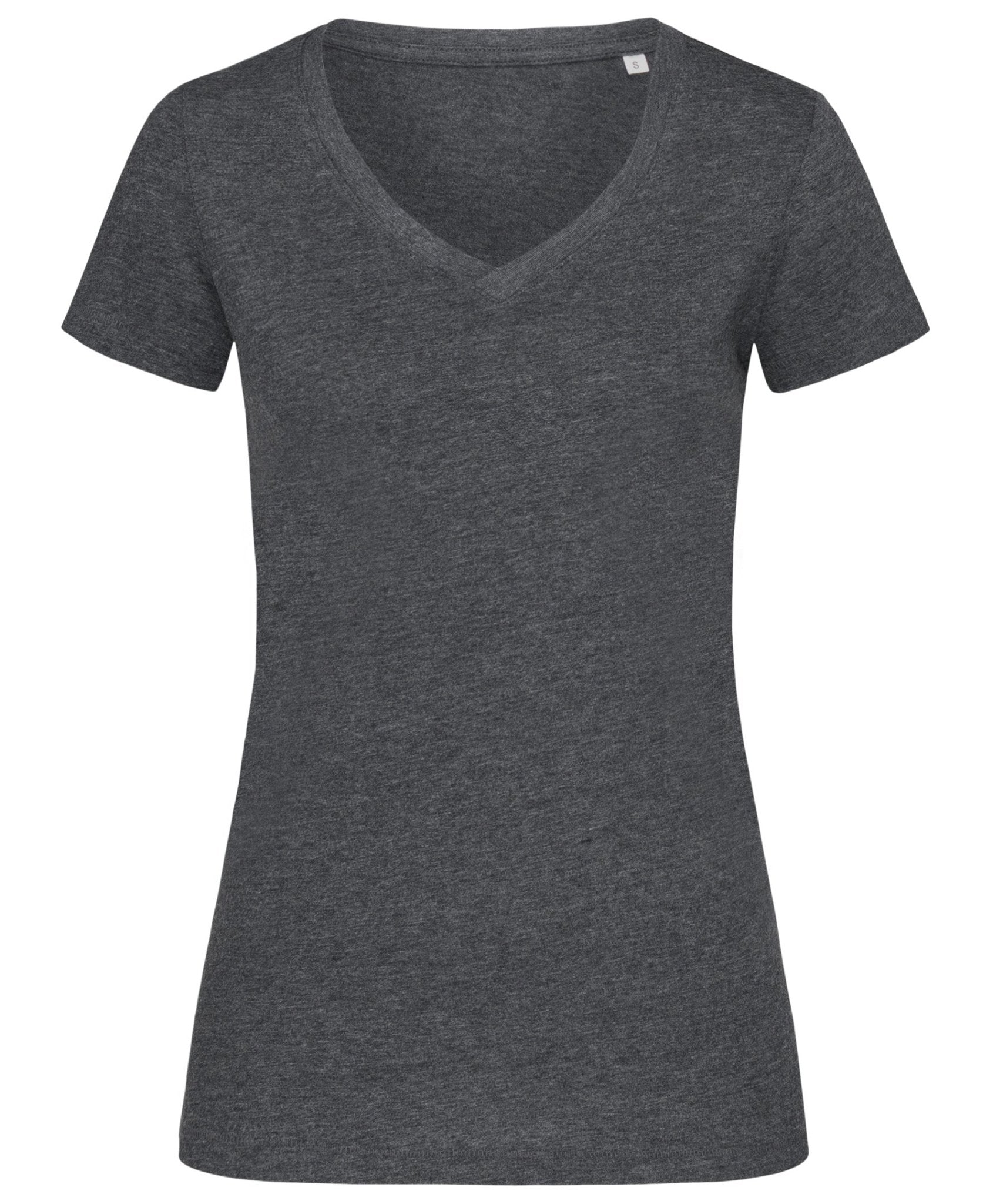 Fashionable T-shirt for women, made of soft cotton-polyester-melange with overlapping V-neck and decorative grain stitches on sleeve and bottom hem.